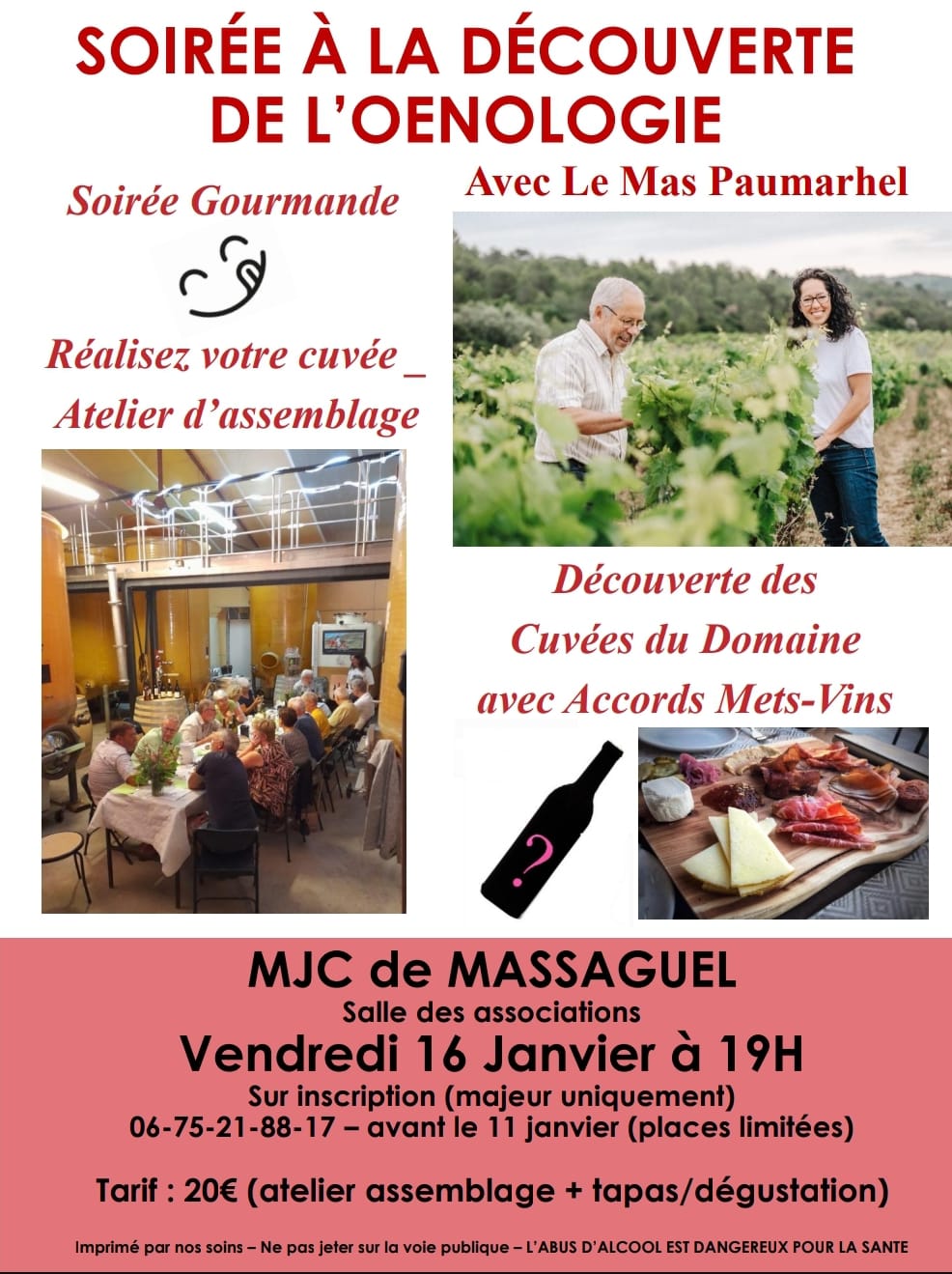 La MJC de Massaguel organise une soirée à la découverte de l’œnologie, le vendredi 16 janvier à 19h, MJC de Massaguel à la Salle des Maisons.